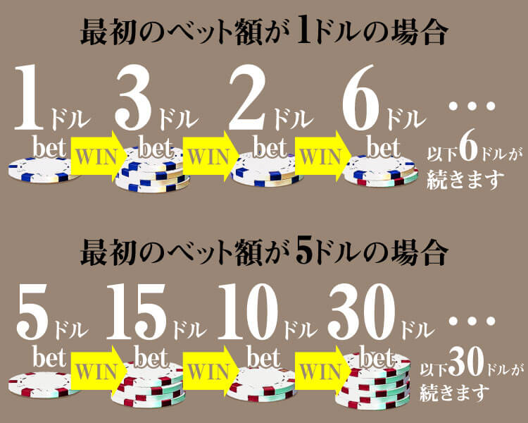 ゲームに連勝する度にベット額を最初の金額の3倍→2倍→6倍→6倍(以降ずっと6倍)に変化させます。