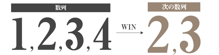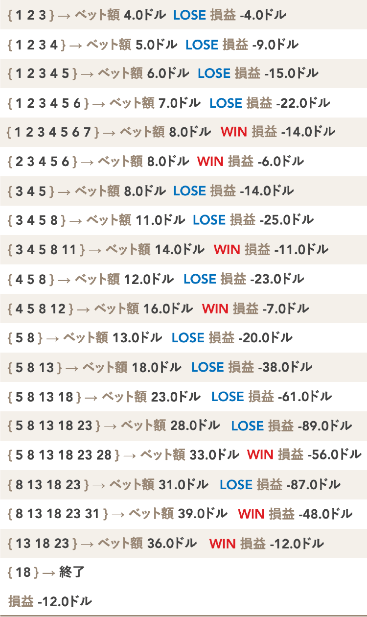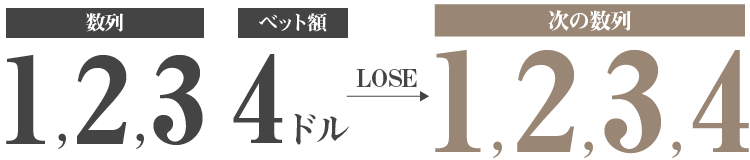 4ドルをベットして負けたときは「1,2,3」の右端に4を書き足して「1,2,3,4」となります。