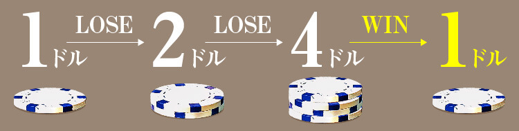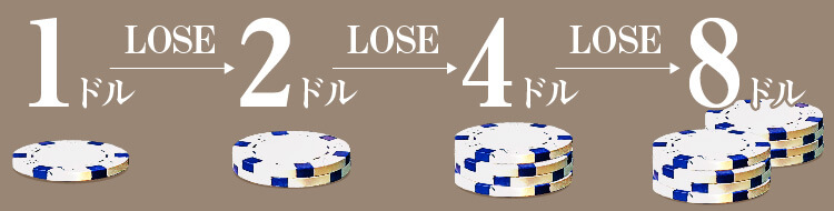 例えば最初に1ドルをベットしたとき、負けるたびに2ドル→4ドル→8ドルとベット額を2倍に増やします。