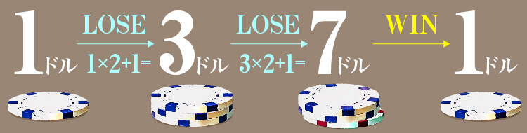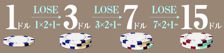 例えば最初に1ドルをベットしたとき、負けるたびに1ドル→3ドル(1×2+1)→7ドル(3×2+1)→15ドル(7×2+1)とベット額を増やします。