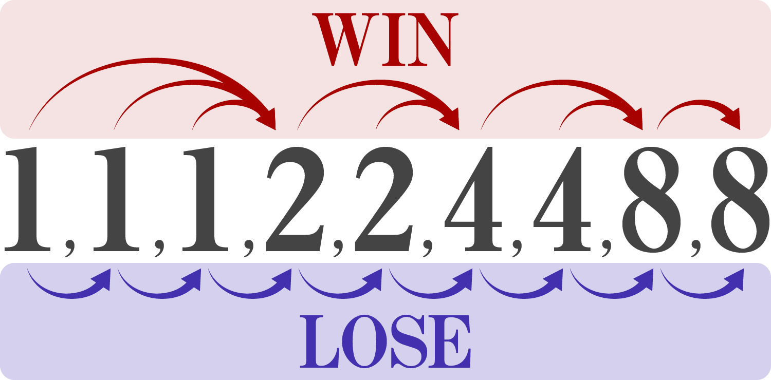 初めに負けたときは「1,1,1,2,2,4,4,8,8」の左端の数字を消して「1,1,2,2,4,4,8,8」となります。