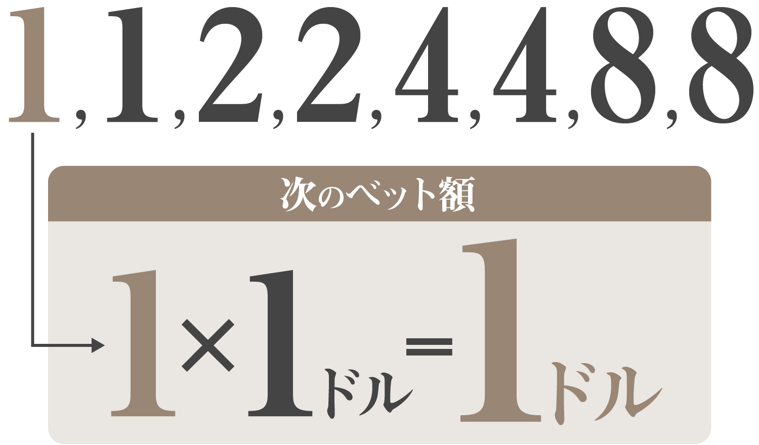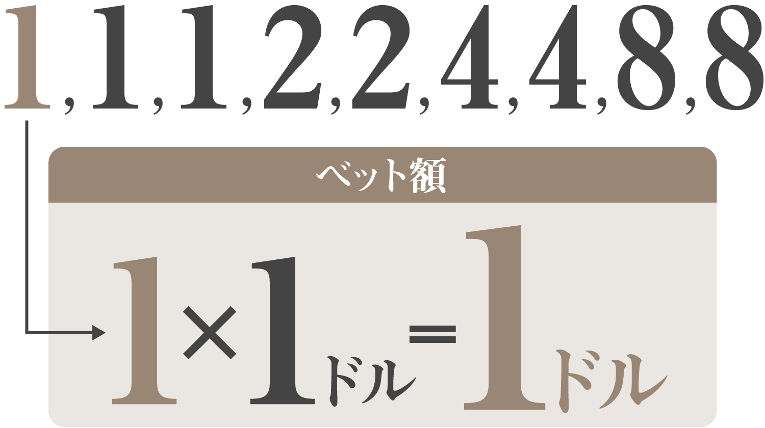 ベット単位が1ドルの場合、掛け金は1ドル→2ドル→4ドル→8ドルと増えていきます。